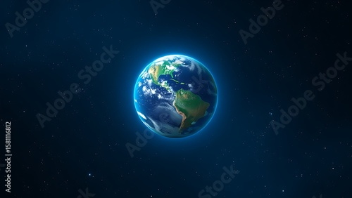 Earth floating in a starry cosmos with a glowing blue atmosphere, surrounded by ethereal nebula lighting.