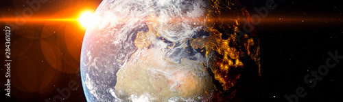 Earth from space with bright sun flare and city lights in the shadows panoramic