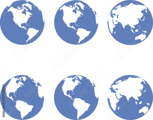 Earth globe icon set in blue and white outline style featuring global views of continents including Asia, Africa and Americas