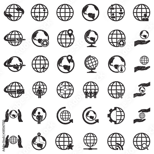 Earth Globe Icons. Black Scribble Design. Vector Illustration.