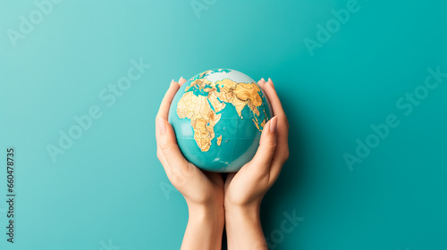 Earth globe in woman's hands on a blue background. ai generative