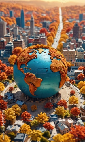 Earth Globe Model in Autumn Cityscape.