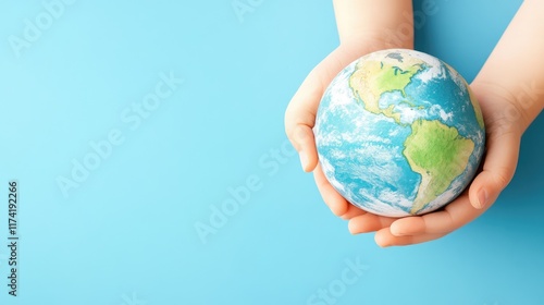 Earth globe planet in kid's tender hands against blue background with copy space. World environment day, Earth world protection concept
