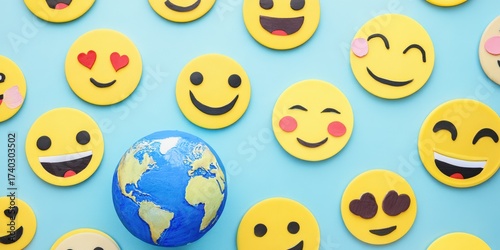 Earth globe surrounded by diverse happy emojis communicating emotions