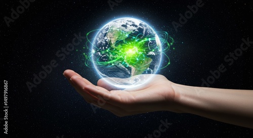 Earth held in a hand, glowing network
