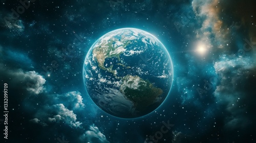 Earth Orbiting in Starry Space with Clouds and Celestial Light
