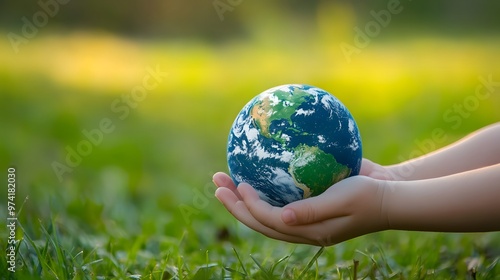 Earth Resting in a Child’s Hand: A small child's hand gently holding the Earth, with a blurred green field in the background, symbolizing the future.