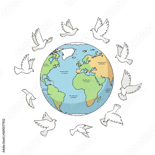 Earth surrounded by doves, symbolizing peace and harmony around the world.