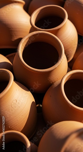 Earthenware vessels cascade in rustic splendor, reflecting artisan traditions with warm sunlight