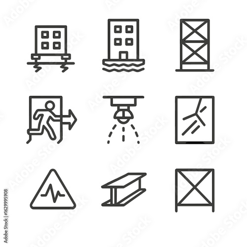 Earthquake Safety Icons. Outline icon set of earthquake building safety features: shock absorber, base isolation, reinforced