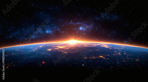 Earthrise: A breathtaking view of Earth from space, showcasing the planet's vibrant curves against the backdrop of a star-studded cosmos, with the sun rising majestically over the horizon.