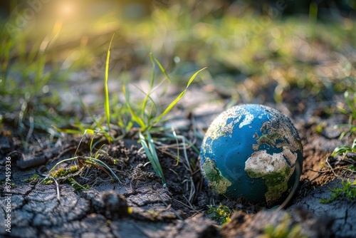 Earth-themed decorations featuring a globe-shaped tree amidst a green environment. Beautiful simple AI generated image in 4K, unique.