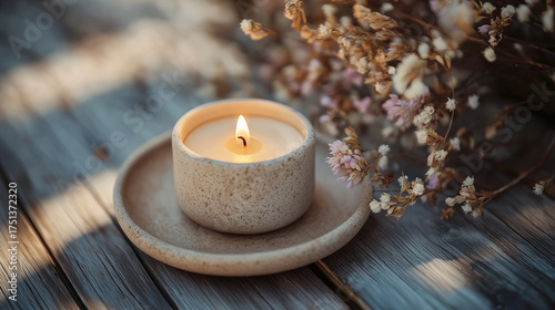 Earthy evening light scene with ceramic, stone and florals in a minimalist aesthetic..
