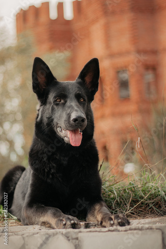 East European Shepherd black German shepherd dog portrait lay on the background of the castle