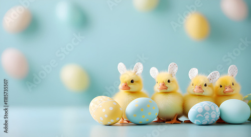 Easter animal cosplay concept. Cute yellow chicks with bunny ears sit beside pastel Easter eggs against a soft blue background, evoking a festive spring vibe.