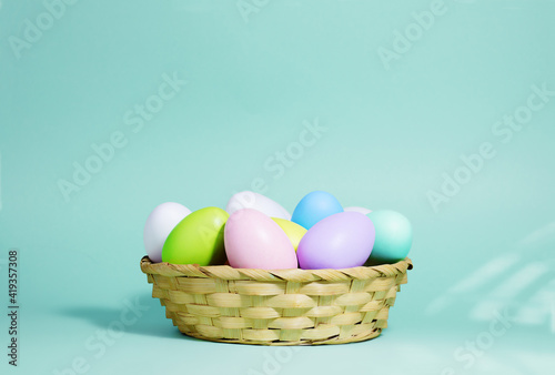 Easter background. A collection of Easter eggs in pastel colors in a basket on a blue-green background, with harsh shadows and light.
