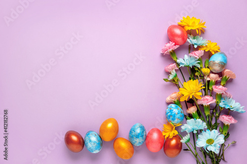 Easter background with Easter eggs and spring flowers.