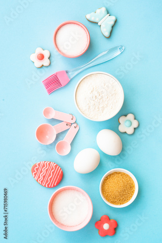 Easter baking background on blue. Flour, edds, sugar and gingerbread cookies. Top view with copy space.