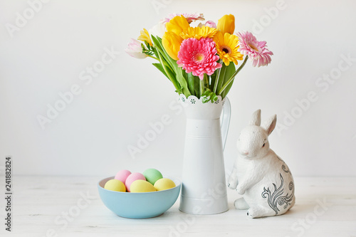 Easter bunny and easter eggs on kitchen table. White rabbit sitting on table with bouquet of tulips and ridge and colorful eggs. Easter decoration with rabbit and eggs. easter card template