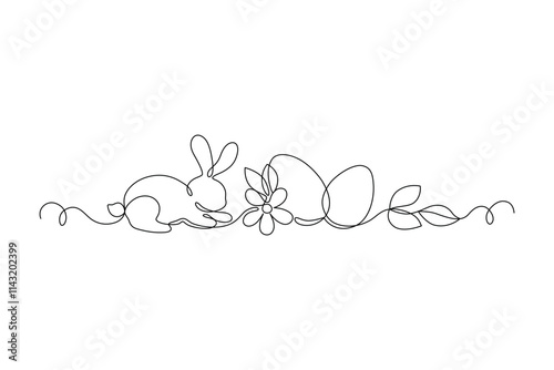 Easter Bunny and eggs drawn in continuous line in minimalism, happy Easter concept, greeting banner design, one line, editable vector contour