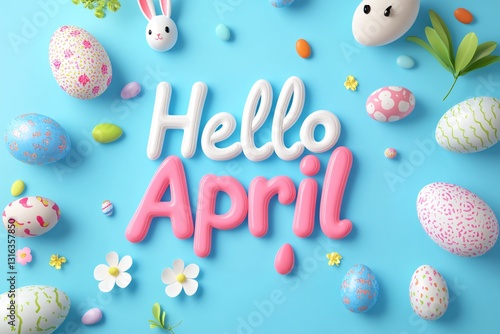 easter bunny, Colorful spring greeting, pastel Easter eggs and cheerful text on blue background, ideal for seasonal promotions or events.