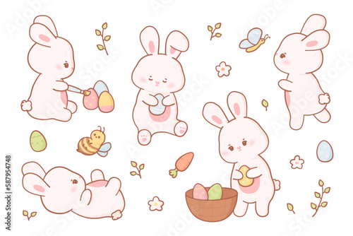 Easter bunny in kawaii style and pastel colors. Vector collection of cartoon rabbits in different poses with eggs, bee and butterfly