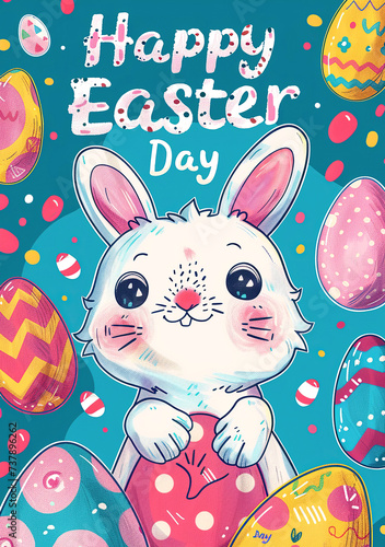 Easter bunny with colorful eggs . Happy Easter. Greeting card
