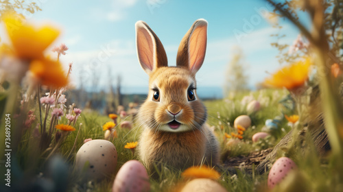 Easter bunny with colorfully colored Easter eggs in the field - greeting card - Easter eggs colorfully painted by children
