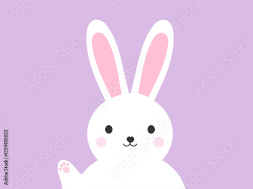 Easter bunny with paw up. Cute white bunny on purple pastel background. Happy Easter card. Vector illustration.