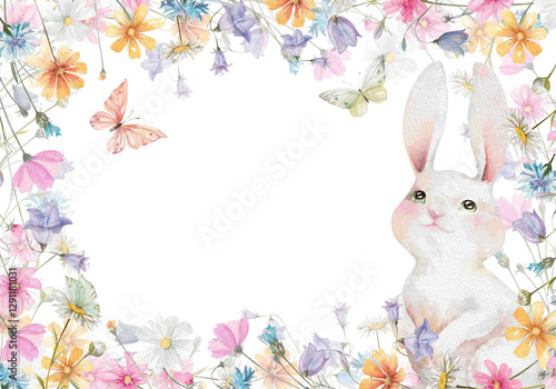 Easter bunny with spring wild flowers and butterflies watercolor frame template for holiday designs