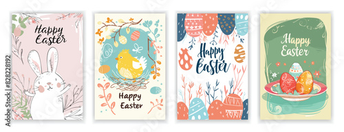 Easter Card Set with Hand-Drawn Cute Flyers and Postcards Featuring "Happy Easter" Text. Rabbit, Church, Chicken, Easter Eggs, Chicken Nest Egg on Background. Vector Illustration