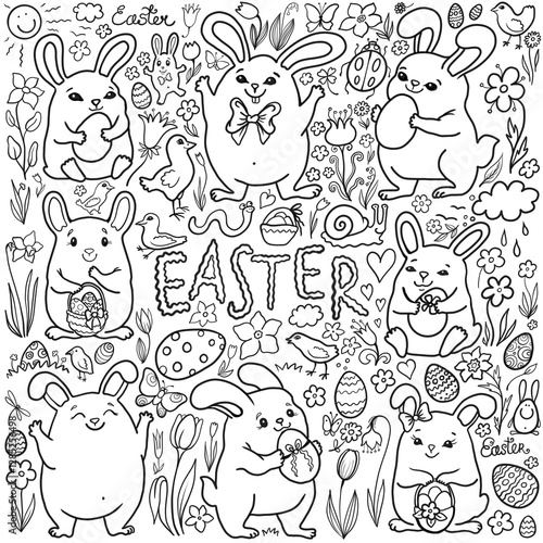 easter cartoon animal set of rabbits bunny and eggs black and white coloring book card