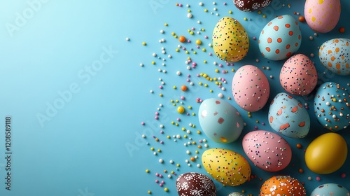 Easter celebration concept with colorful decorated eggs on blue background for holiday design