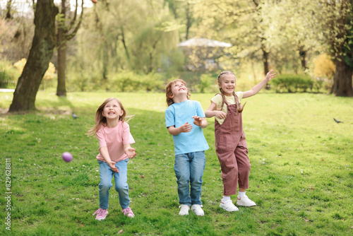 Easter celebration. Cute little children hunting eggs outdoors