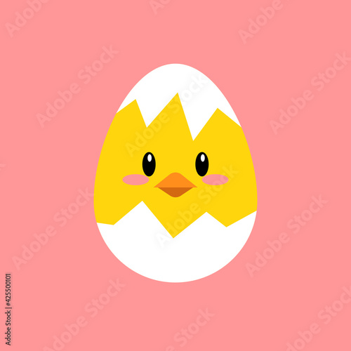 Easter chick with egg. Funny chicken in egg shell isolated on pink background. Cute cartoon character. Vector illustration in flat style