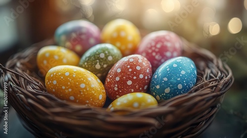 Easter, close-up of vibrant Easter eggs in a basket, soft lighting