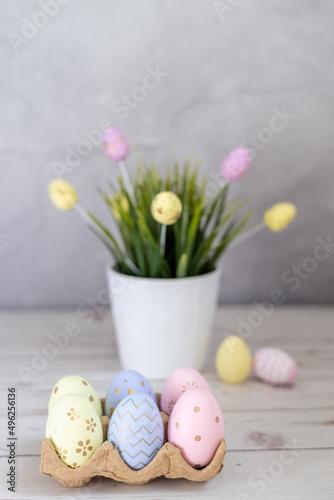 Easter composition with Easter eggs and grass on a gray background