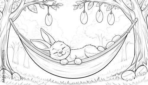 Easter Day: Vintage Drawing of a Rabbit in a Hammock with Eggs and Nature. A black and white illustration of a rabbit sleeping in a hammock.