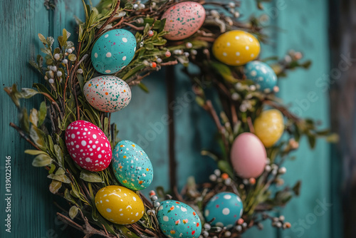 Easter Decorated Wreath Nest with Colorful Painted Eggs and Spring Foliage, Festive Holiday Celebration, Generative AI