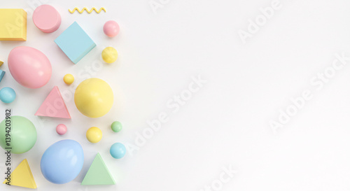 Easter decoration, Colorful geometric shapes and Easter eggs on a white background with copy space