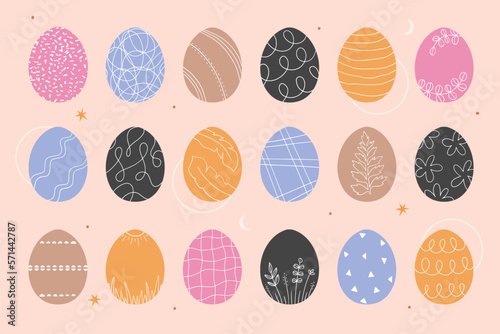 Easter egg collection decorated with Scandinavian style patterns, ornaments and textures. Coloured flat style painted eggs