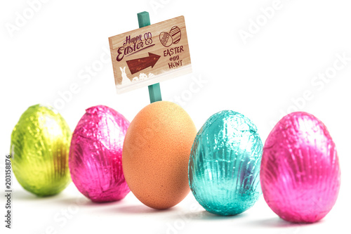 Easter egg hunt sign against four easter eggs in a row with one real egg