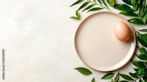 Easter egg nestled on a delicate plate surrounded by fresh green leaves