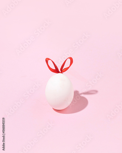 Easter egg with ribbon bunny ears, creative concept, pastel pink background.