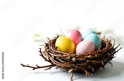 Easter eggs in a bird's nest, a place for text. Selective focus, blurred background. Easter card, banner, template.