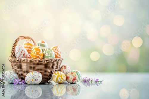 Easter eggs in a wicker basket with a blurred background creating a festive spring holiday scene