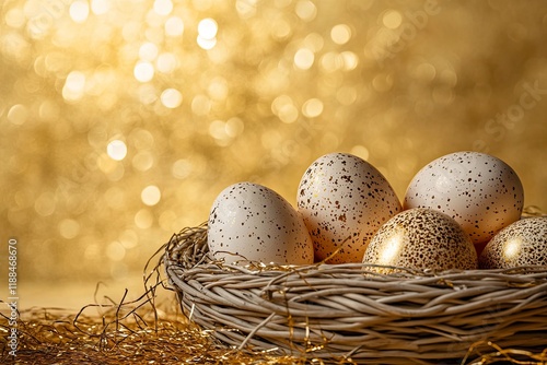 Easter eggs in wicker basket over golden background