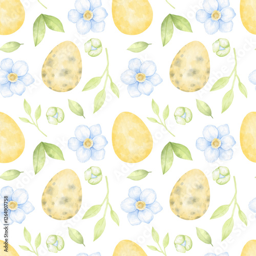 Easter eggs, leaves, flowers. Seamless watercolor pattern in pastel colors. Cute spring illustration for Easter