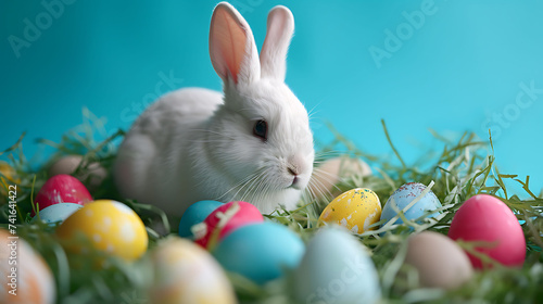 Easter Eggs with white bunny on pastel background