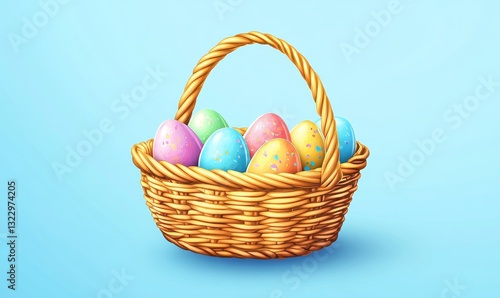 Easter holiday celebration banner greeting card with pastel painted eggs in bird nest on bright blue backround tabel texture. Top view, flat lay with copy